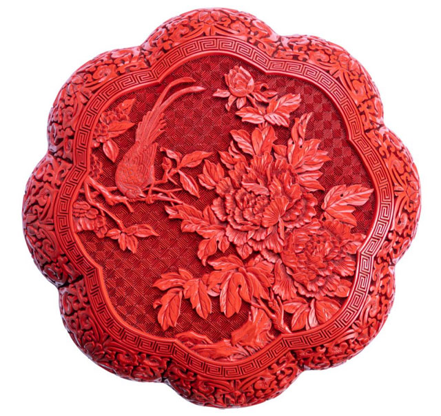 剔红《富贵长寿》八瓣捧盒